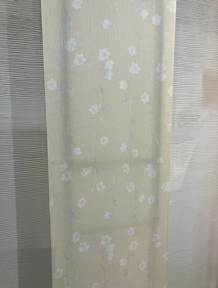 淡い黄色の地色にすずらんの花が全面に描かれ経絽独特の雨のような透け感で清涼感を醸し出しております。