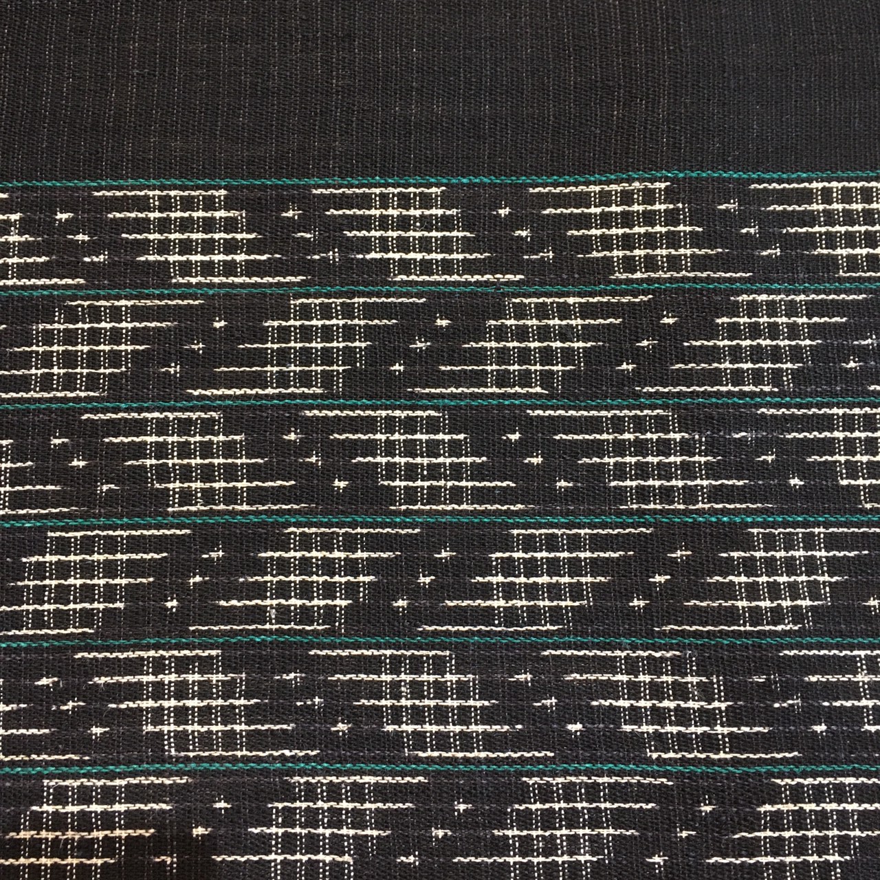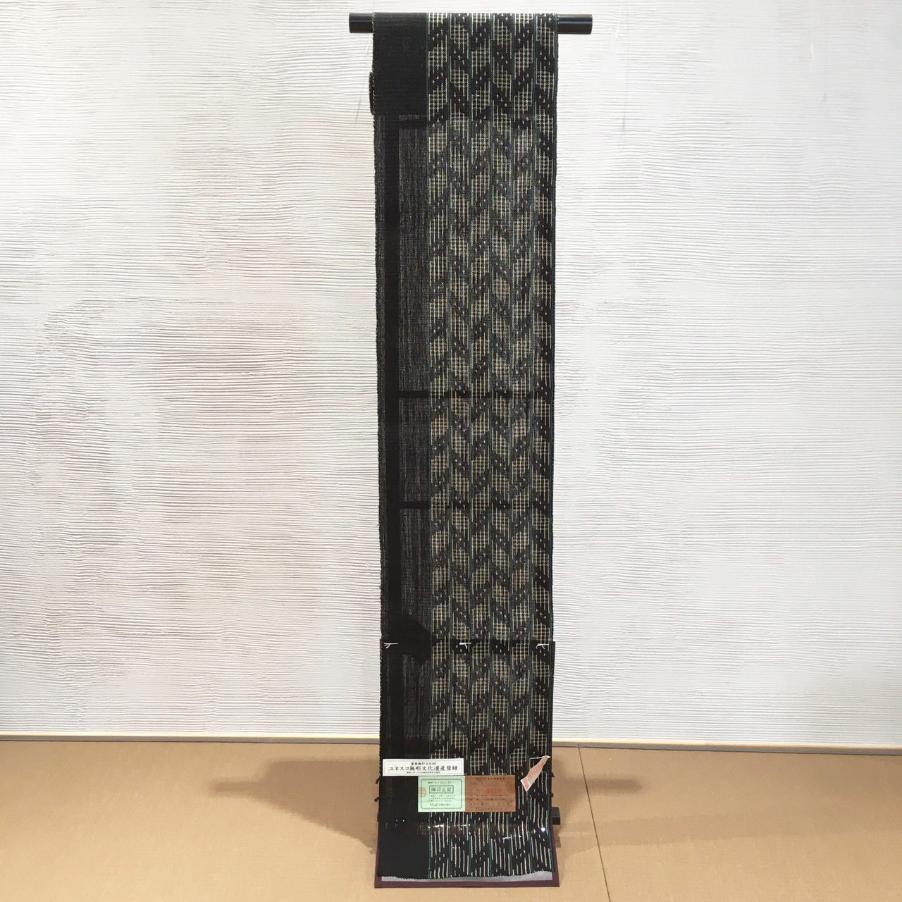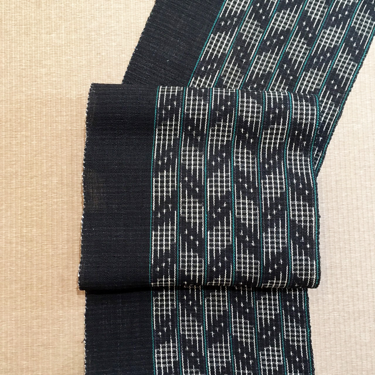 黒地のベースに生成色とグリーンで織られたまさに芸術的な逸品は、