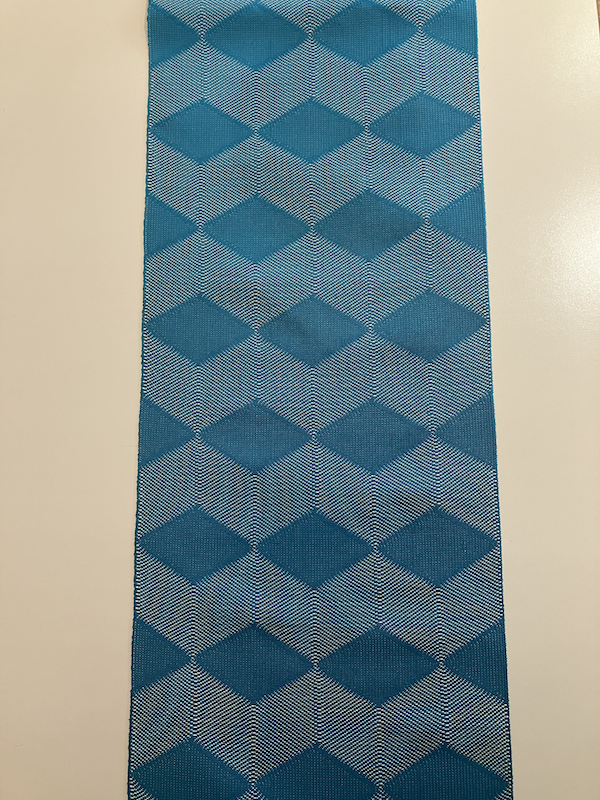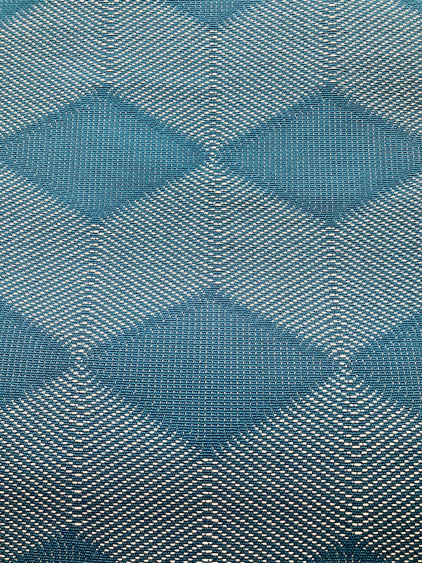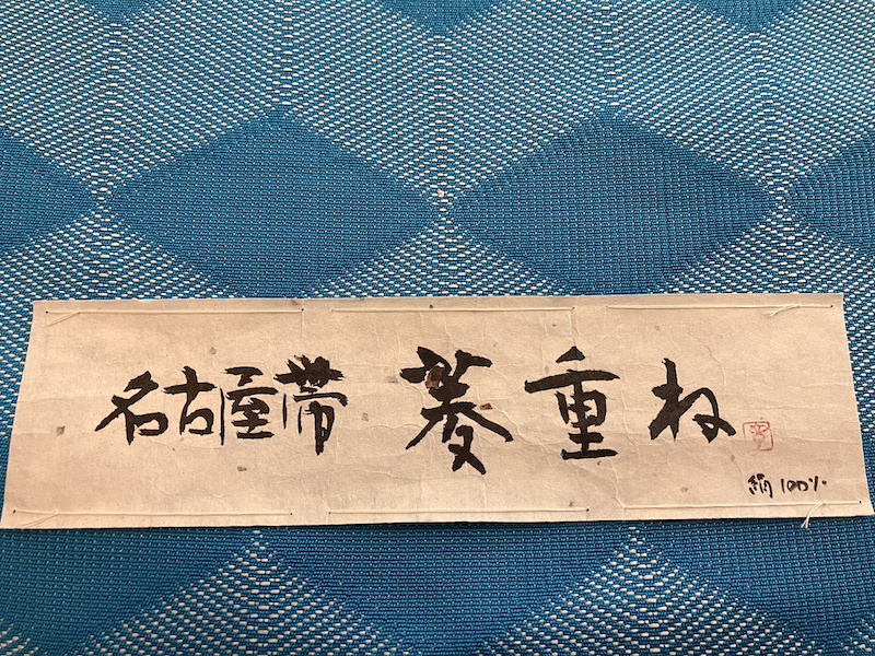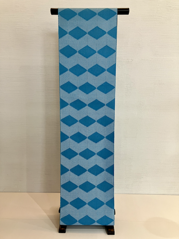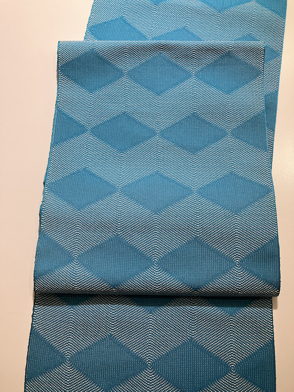 鮮やかなブルーの菱が美しく織り込まれた八寸名古屋帯のご紹介です。