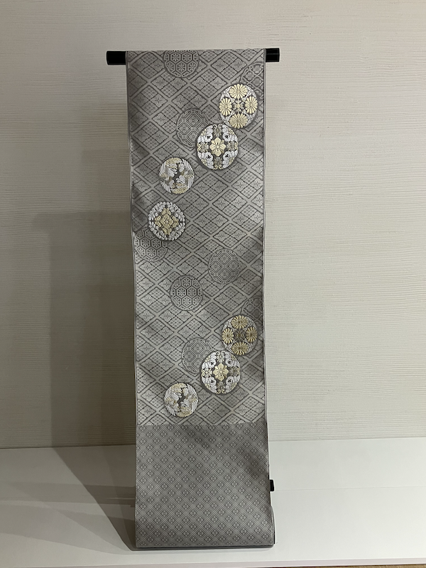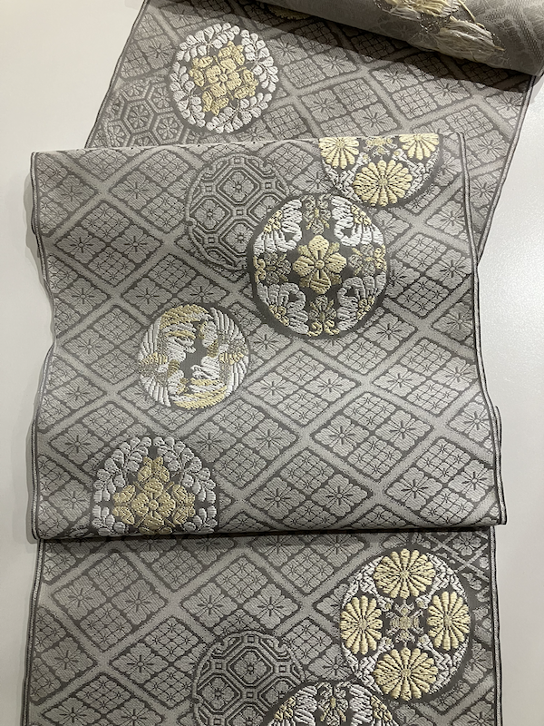 お茶会の色無地なんかにピッタリの、上品な九寸名古屋帯です。グレーの地色というのはお着物の色は何色にも合わせやすく、コーディネートのパターンが増えますね。