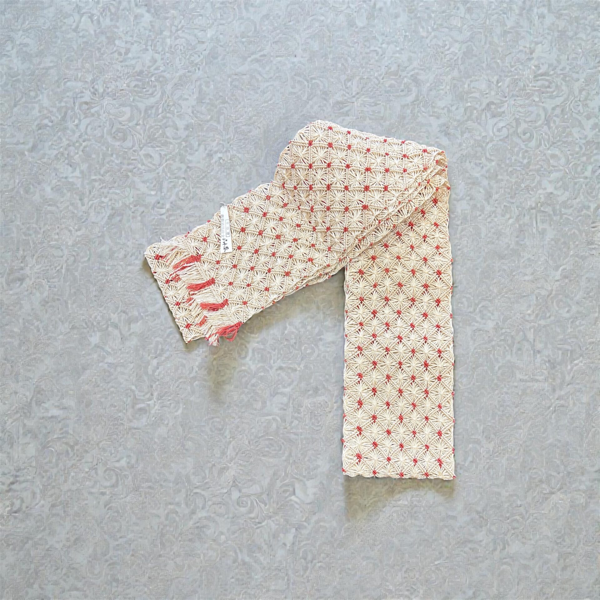 こちら、王道の生成り色に赤のドットがデザインされた