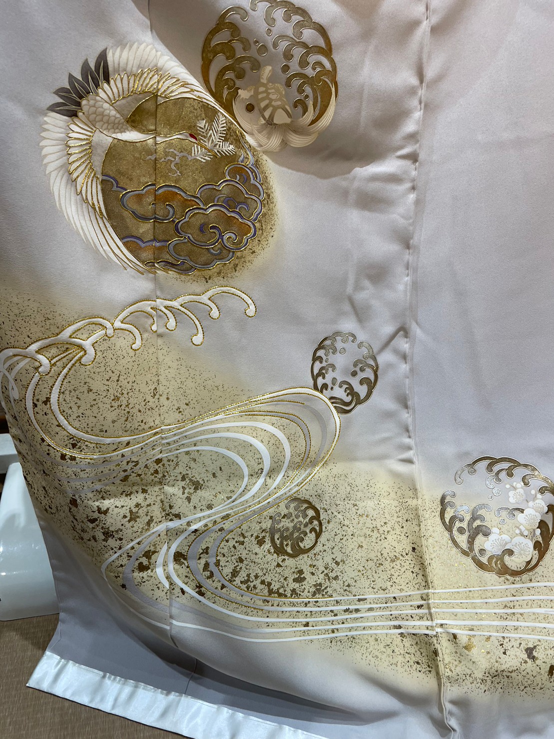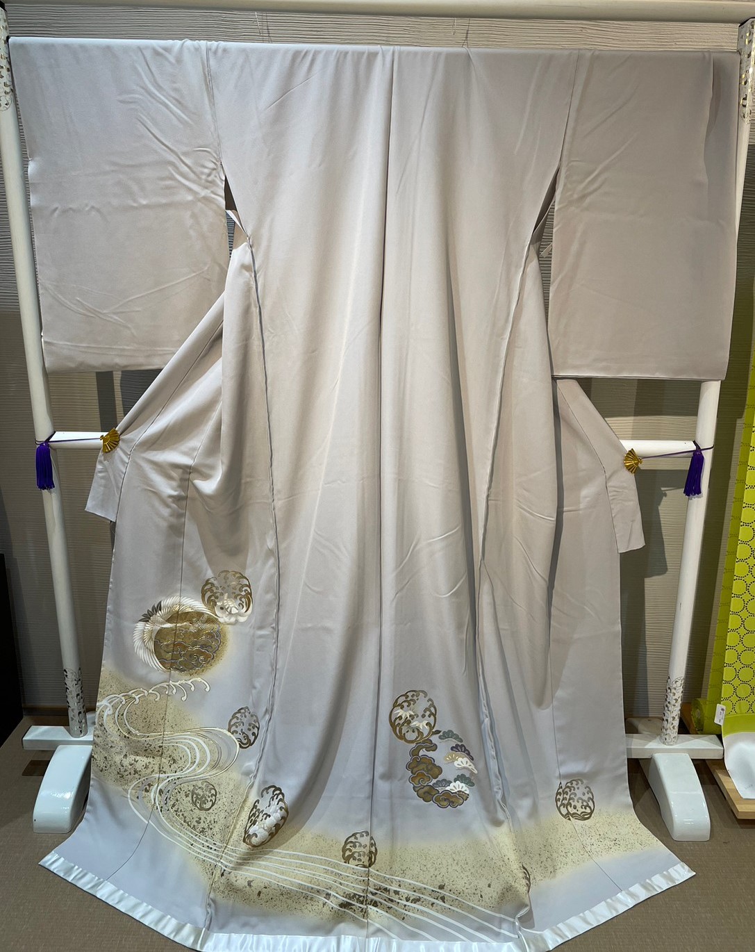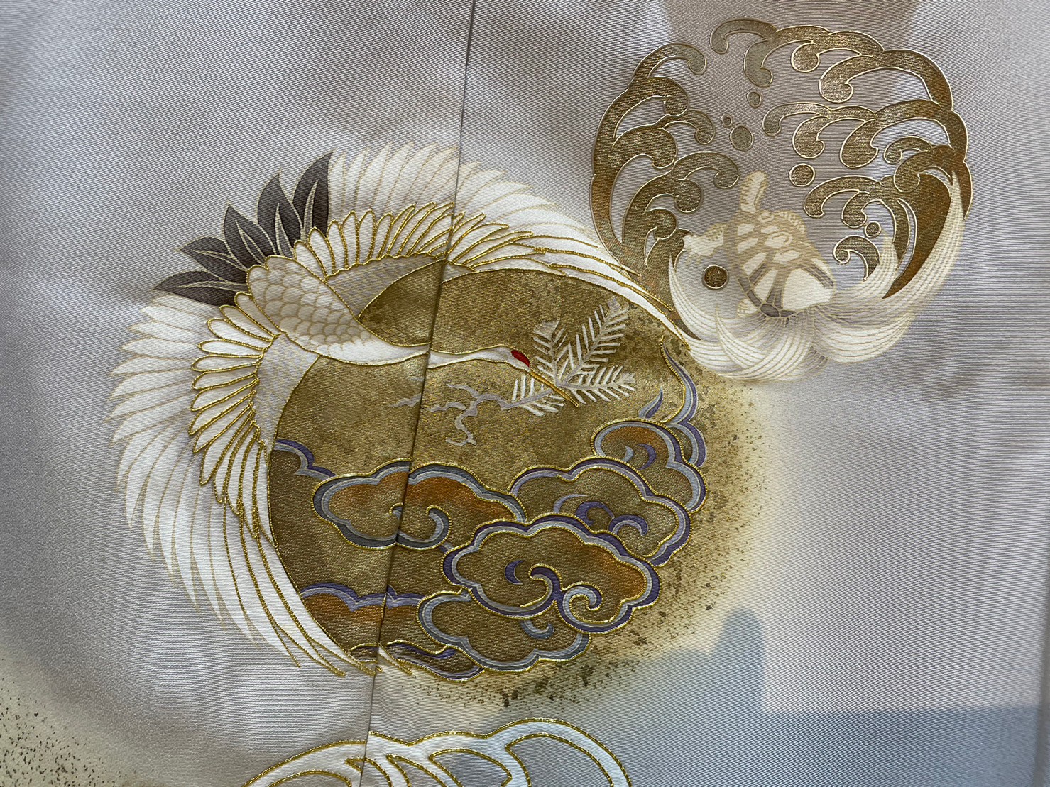 グレーの地色に金箔や金糸で波や流水が描かれた逸品です。