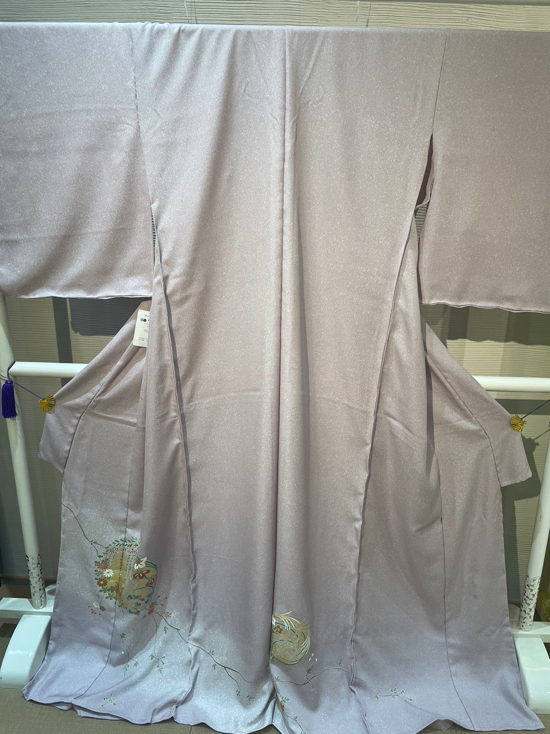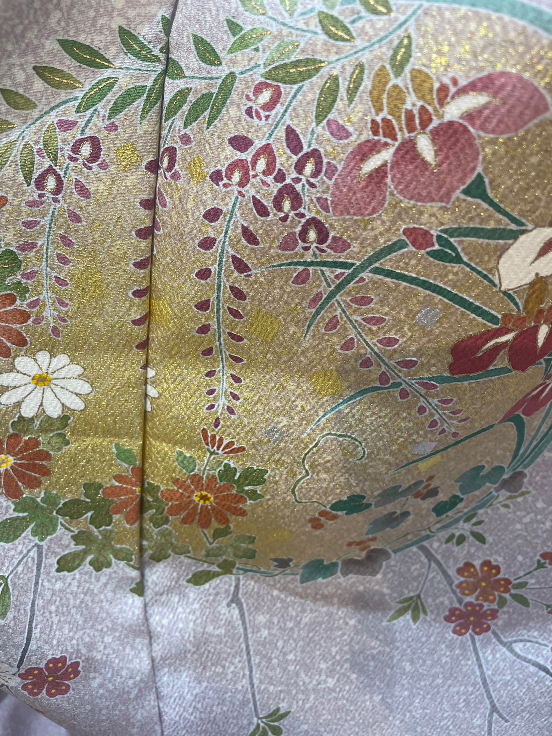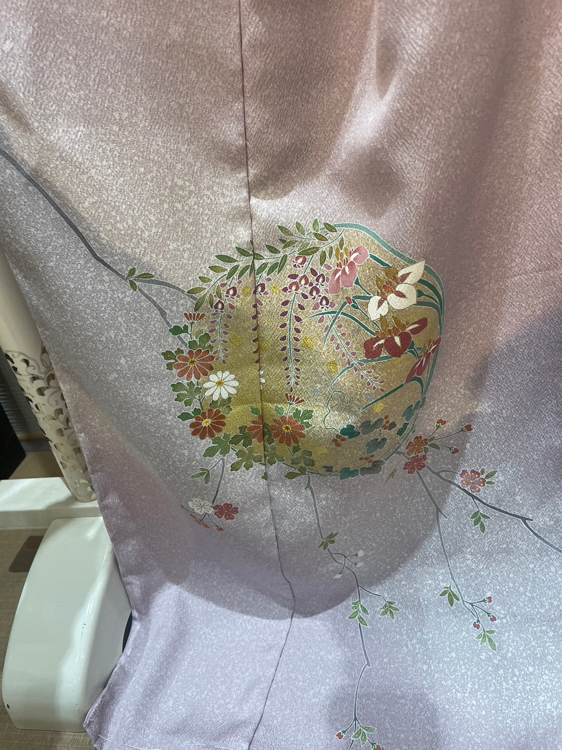 薄紫の地色に四季の草花が描かれた大変上品なお品になります。