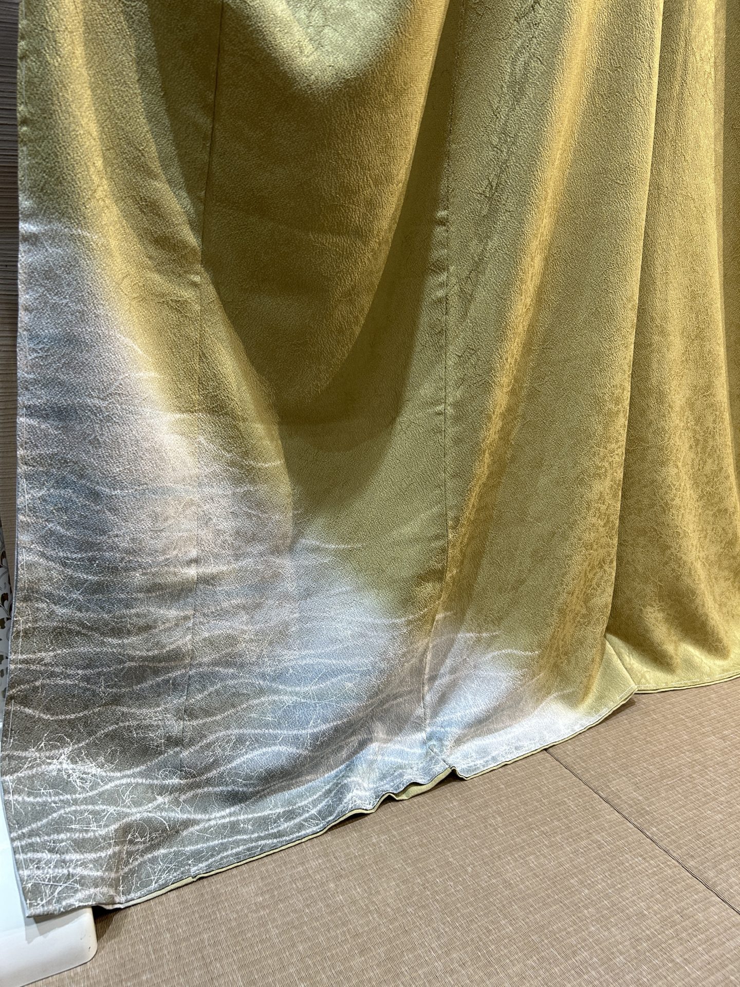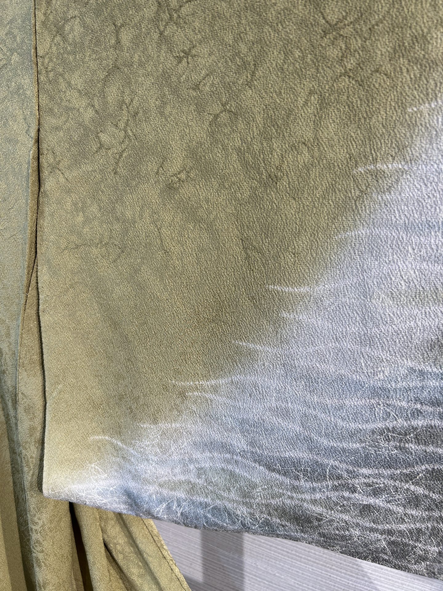 抹茶色に綺麗な波柄のぼかしがすそと袖だけに