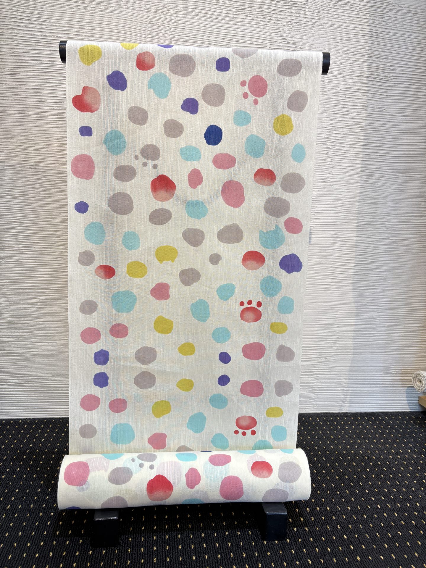 クリーム色の優しい地色にカラフルな水玉がとても素敵な心踊るゆかたです。